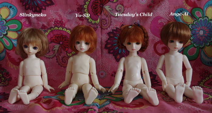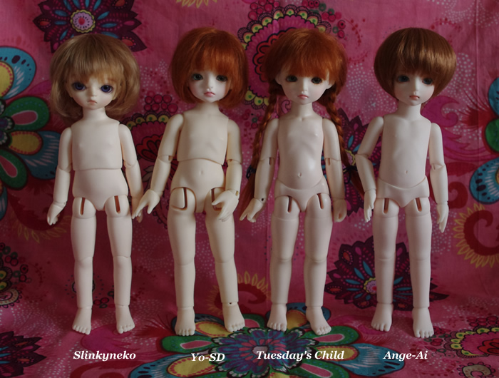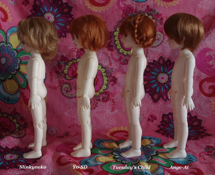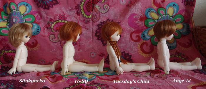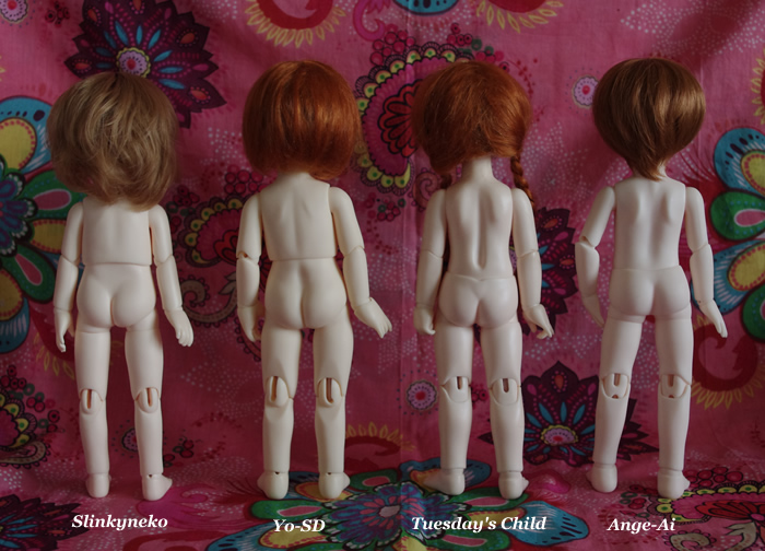 写真でも分かるように、体型的にウエスト分割の幼SDとSlinkynekoのボディは、Tuesday's ChildやAnge Aiの腰分割組に比べて幅広です。特にSlinkynekoの上半身は幅が広くなってます。